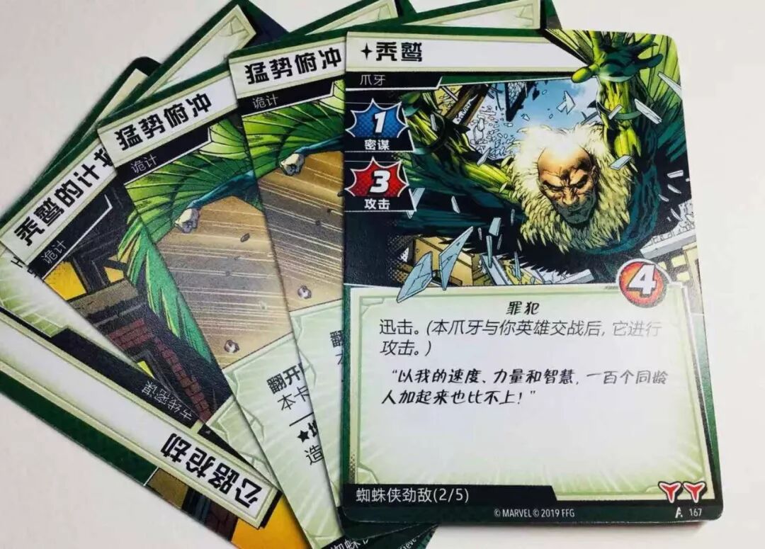 但《漫威群英传》里最有意思的设计是给每个超级英雄角色对应设计了专属的反派角色,这些反派只会出现在他们原作中最宿敌的战斗力,也就是当玩家选取某个英雄的时候就会带上这个宿敌反派,比如秃鹰 就是小蜘蛛牌组中才可能登场的宿敌反派(可想而知,以后 绿魔 十之八九也是这种宿敌身份才会出现了)。这种设计让了解原著的玩家会立刻被带入到超级英雄和宿敌反派的对手戏里去,很多剧情画面直接脑补,代入感大大加分。