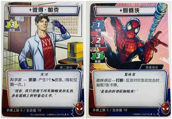 这无疑是卡牌游戏最容易实现让玩家带入到角色的方式,事实上就算有其他配件可选,一般游戏中也会用卡牌或卡片的方式来呈现玩家角色信息,这算是卡牌载体的天然优势之一。《漫威群英传》中英雄卡可以反转,游戏开始时要选择“第二身份”这面,也就是超英们日常生活里的样子,而反转之后则是他们的超级英雄形态。