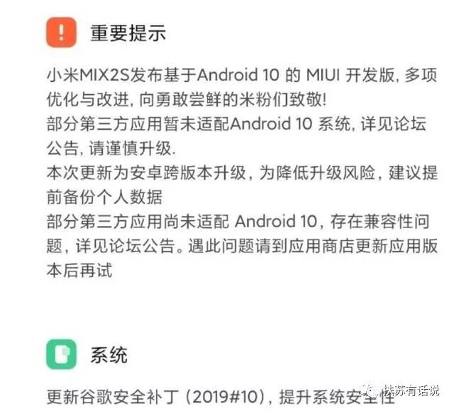 同时,在MIUI 11内测版的更新日志中,小米这家国产智能手机厂商表示,部分第三方应用暂未适配Android 10系统,存在兼容性问题。也即很多第三方应用,目前还主要是兼容到安卓9.0版本的系统。因为这一前提,小米MIX 2S升级至Android 10版本后,未适配的应用将无法正常使用。并且,小米MIUI还强调,本次更新为安卓跨版本更新,为降低升级风险,确保升级更新的顺利进行,小米MIX 2S的用户不仅需要清理楚足够的机身存储空间,还需要对手机中的重要数据信息进行备份。因为相对于稳定版,内测版可能还不是非常完善,所以重要数据自然需要备份处理。在此基础上,小米MIUI向小米MIX 2S的用户表示,应当谨慎升级。