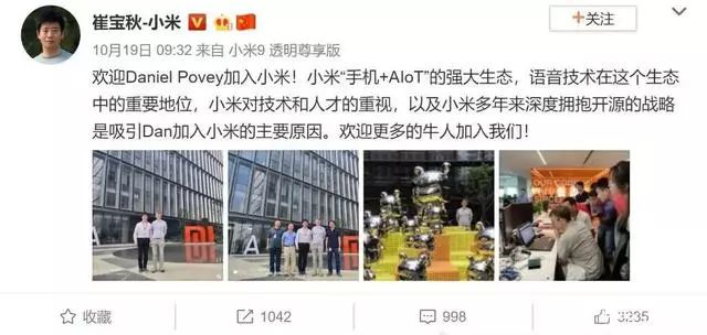为了继续发展AIoT核心,日前小米还邀请国际语音识别大牛Daniel Povey加盟了小米,他是语音识别开源工具Kaldi创始人,也是国际AI语音领域知名教授。