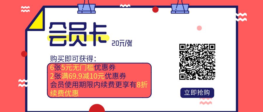 购买会员后,您可获得6张5元无门槛优惠券,2张满69.9减10元优惠券,总计价值50元,会员使用期限内续费会员卡,更享有8折续费优惠(即20元16元)。