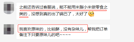 入口酥脆,余味更香,有小米谷物的香味儿,是大部分专业吃货的评价,就这样,米脂小米,就从粮食界成功跨界到了零食界,新品——素食公社小米锅巴,很快就得到了第一批体验用户的认可。