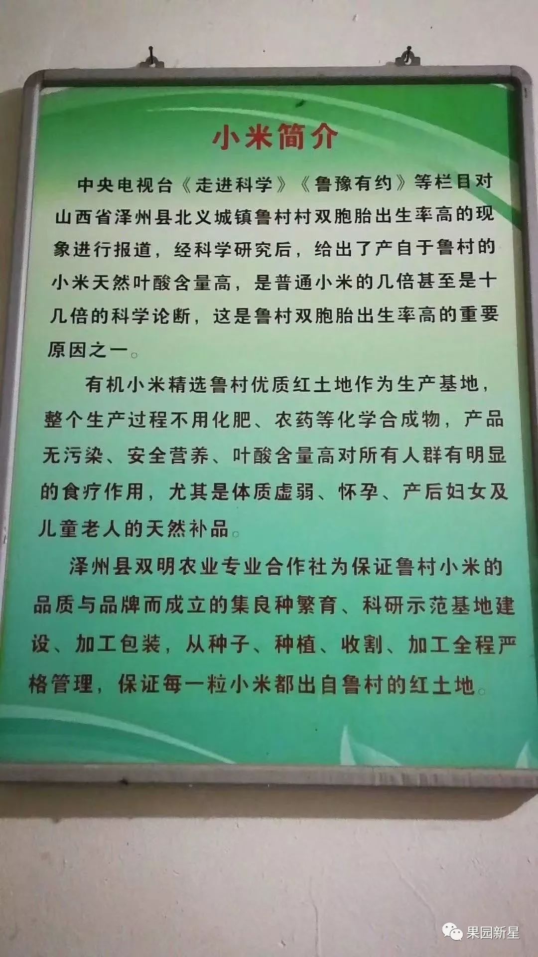 经中央电视台《走进科学》栏目调查研究显示,山西鲁村小米,口感最佳、色泽最好、营养丰富;经权威机构检测,鲁村小米中叶酸含量比其他小米高出数倍。根据国际瑞典科研机构研究发现,服用叶酸的女性较没有服用叶酸的女性,生双胞胎的几率高出近1倍,这也是鲁村作为神奇双胞胎之乡的缘由。