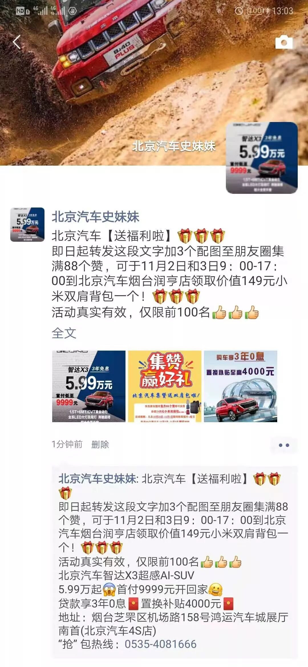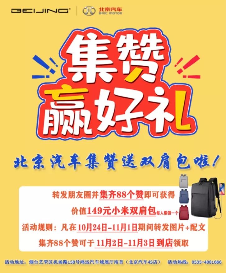 北京汽车【送福利啦】!集88个赞领取小米双肩包一个!