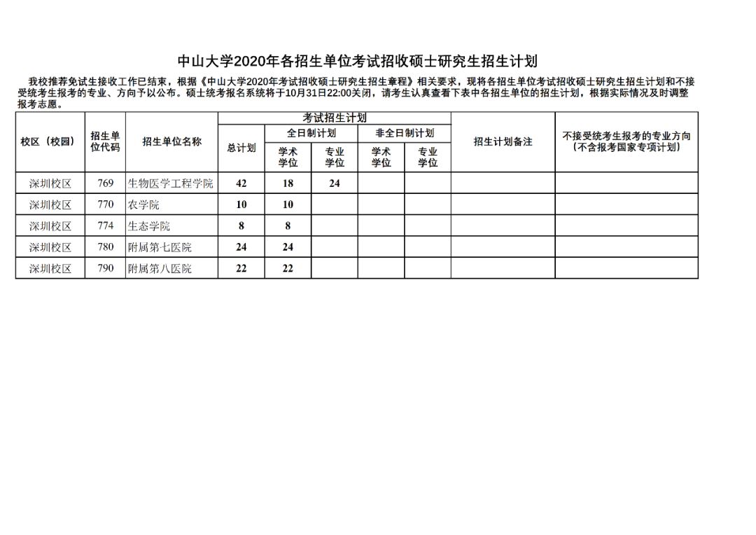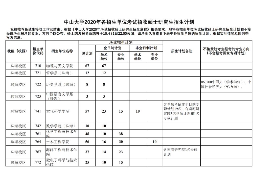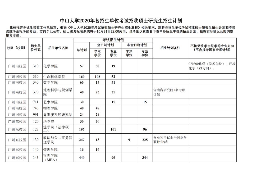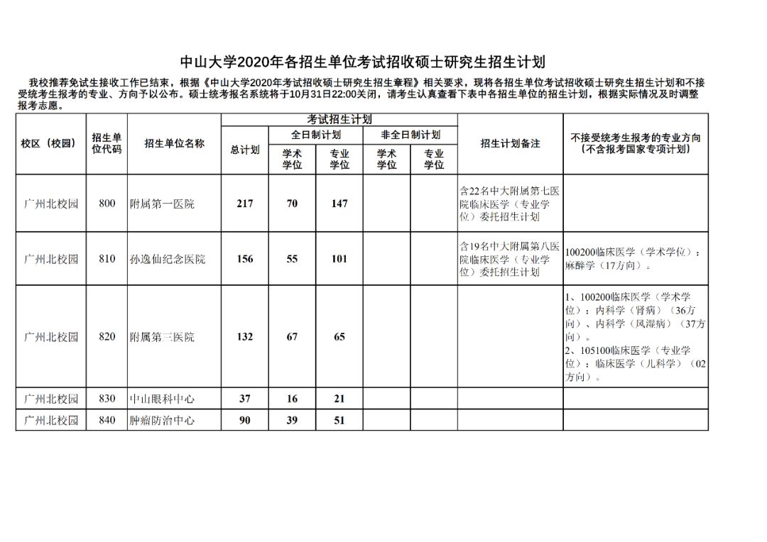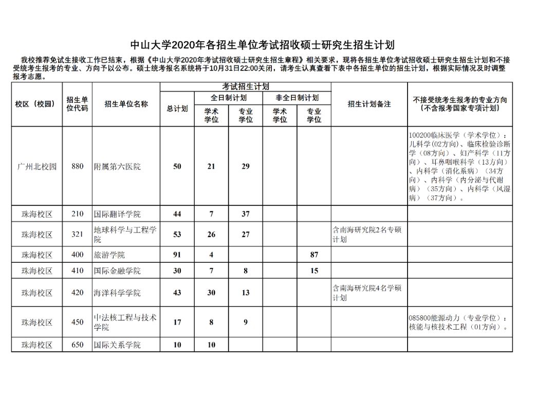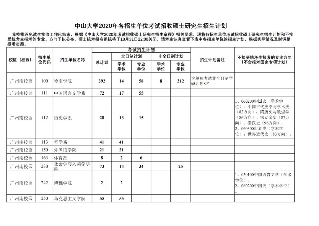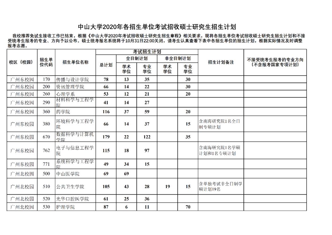 我校推荐免试生接收工作已结束,根据《中山大学2020年考试招收硕士研究生招生章程》相关要求,现将各招生单位考试招收硕士研究生招生计划和不接受统考生报考的专业、方向予以公布。硕士统考报名系统将于10月31日22:00关闭,请考生认真查看下表中各招生单位的招生计划,根据实际情况及时调整报考志愿。详情请见附件内容。
