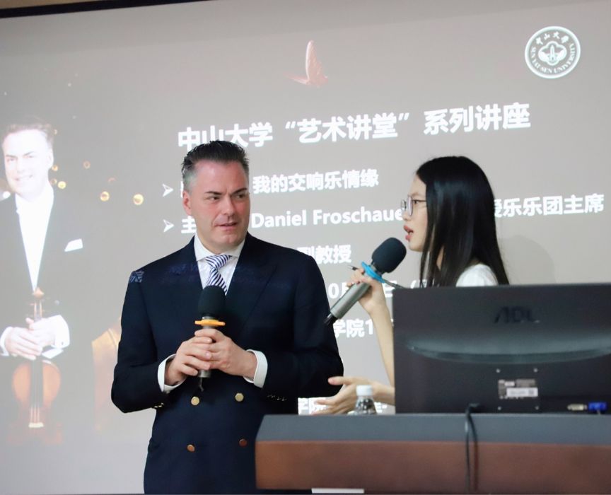 为进一步贯彻落实党的教育指导方针,扎实推进新时代美育工作,提高师生的审美与人文素养,强化美育育人功能。2019年10月24日上午,由艺术学院主办,药学院与管理学院承办的中山大学 “艺术讲堂”系列讲座活动,邀请了维也纳爱乐乐团主席Daniel Froschauer先生,在药学院125报告厅主讲了题为“我的交响乐情缘”的讲座。药学院党委岳辉书记、谭海燕副书记、艺术学院原嫄副教授、李燕副书记及来自各院系的师生150多人参加了讲座。艺术学院马琳副教授主持了讲座。