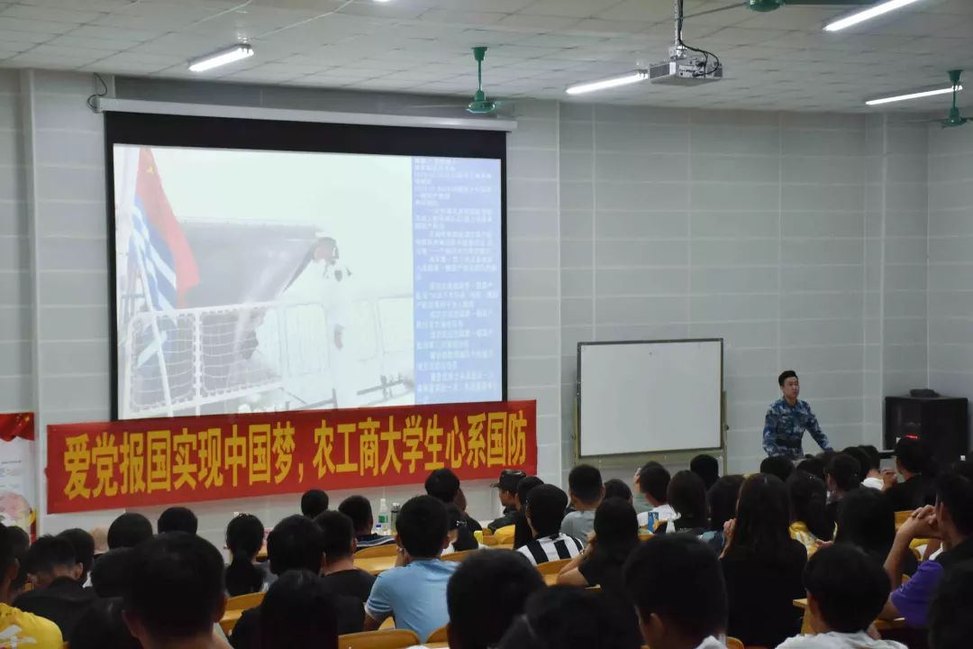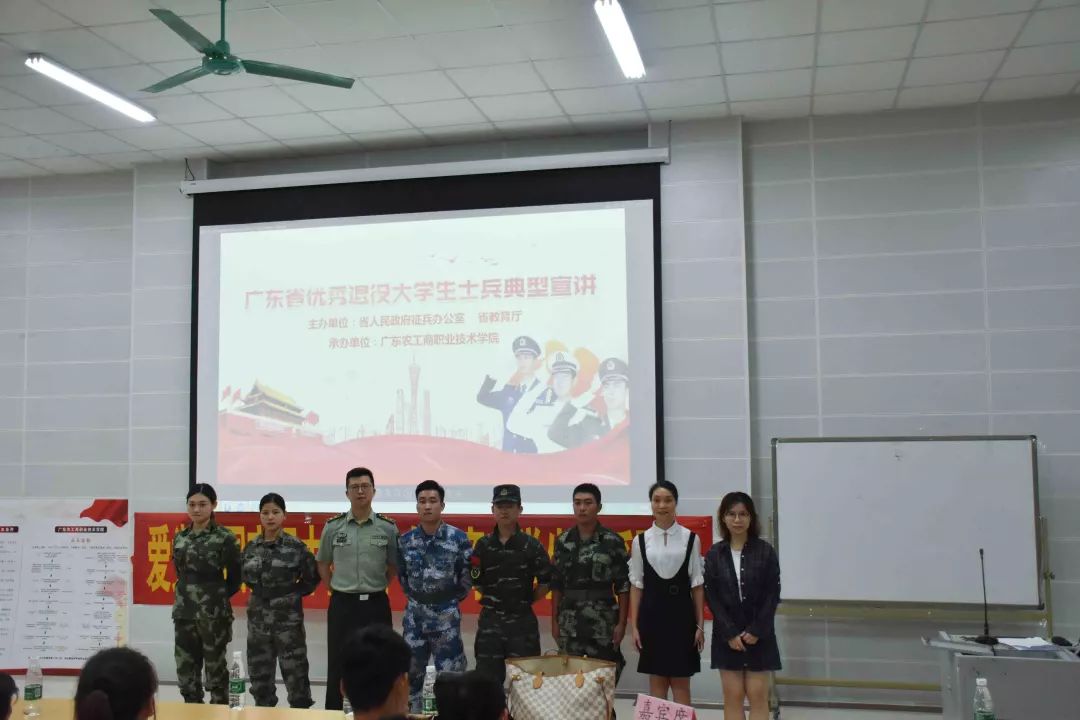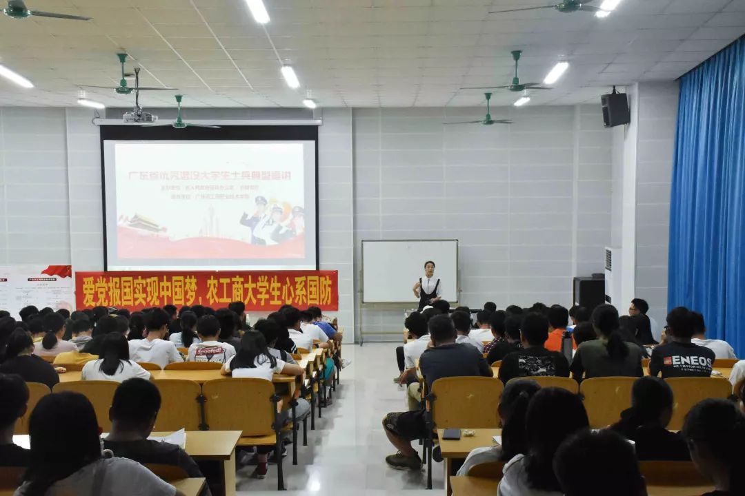 为做好明年征兵准备,进一步激发我省高校大学生携笔从戎、参军报国、自觉履行国防义务的热情,2019年10月24日晚上6:45,广东农工商职业技术学院举行“广东省优秀退役大学生士兵典型宣讲活动”。出席本次活动有广东省人民政府征兵办公室秘书处参谋林坤晖、广东司法警官职业学院刘芬秀、珠海城市职业学院黄灏、中山大学张燕珊、北京理工大学珠海学院何海洋和钟锐华老师以及各学院的学生,主持人是钟锐华。