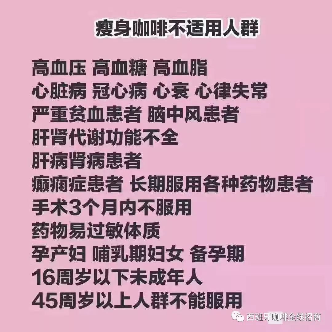 孕妇、婴幼儿、心脏病患者、糖尿病患者、肾病患者以及长期服药人群。内 脏器官有疾病的尽量不要使用 高血压、高血糖、低血糖、低血压人群,初期可饭后食用,身体适应代谢规律之后再正常食 用。食用期间需加大饮水量来促进脂肪的燃烧