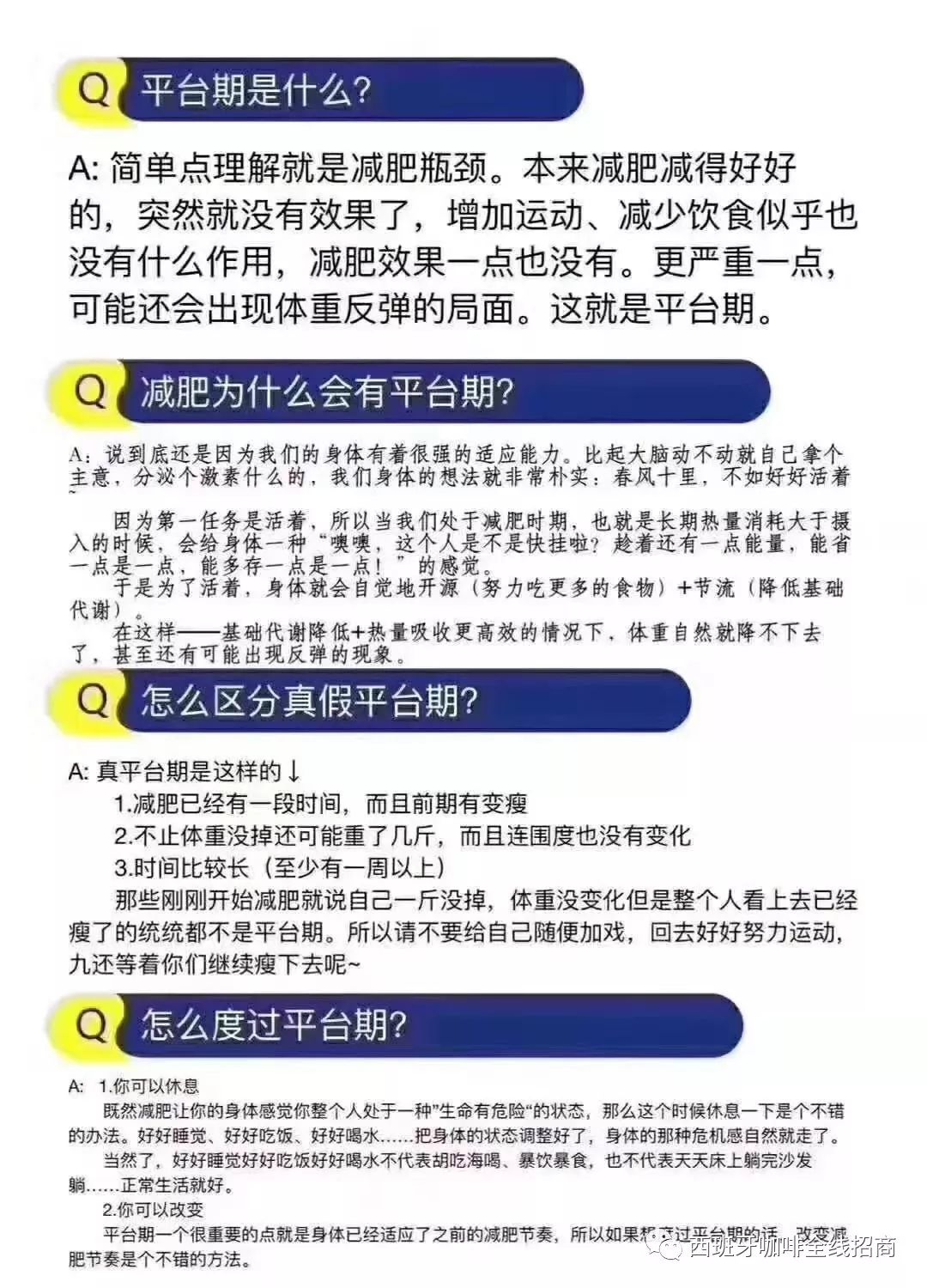 在减肥过程中,体重下降到一定数值以后,体重在较长时间内都不再继续下降,这种情况叫 减肥平台期。这是因为人在减肥过程中,机体要维持基础代谢,避免能源的完全耗竭,当体内能量消耗到一定程度时,机体便产生了保护性抑制。减肥平台期是正常现象,每个人在减 肥过程中都会出现平台期,只是时间长短不同。属于健康减肥,健康减肥都是一个阶梯形的过程:当出现体重降得快一个时期后,接 下来会有一个体重稳定的过程,在体重稳定的过程中也就是平台期也要非常认真的使用产品, 这个期间体重降得慢了,但体围一般还会减,稳定期时间因人而异,稳定过后又是一个快速 减重期,坚持服用吧,一定可以瘦的。