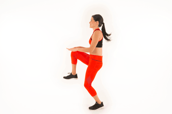 最后我们站起来,将双手平放至腰间前,接着原地跑起,确认膝盖碰至手掌,重复一分钟。