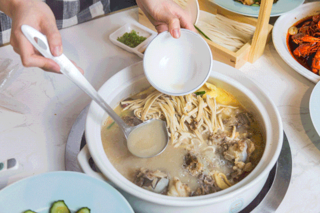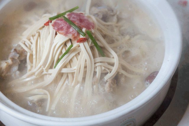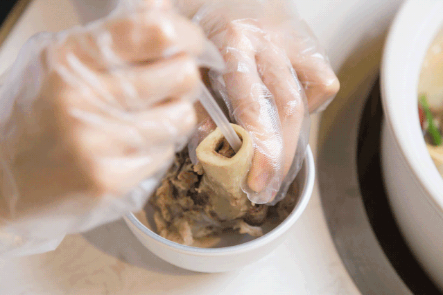 汤是筒骨砂锅的灵魂,留下来筒骨砂锅那致命的吸引力,就在藏在这一锅汤里。先用大火让骨头的蛋白质快速分解,再用中火让骨肉炖到酥烂,最后文火慢炖,把营养成分全部融入汤里,直到骨汤呈现诱人的乳白色,就可整锅端上桌了。