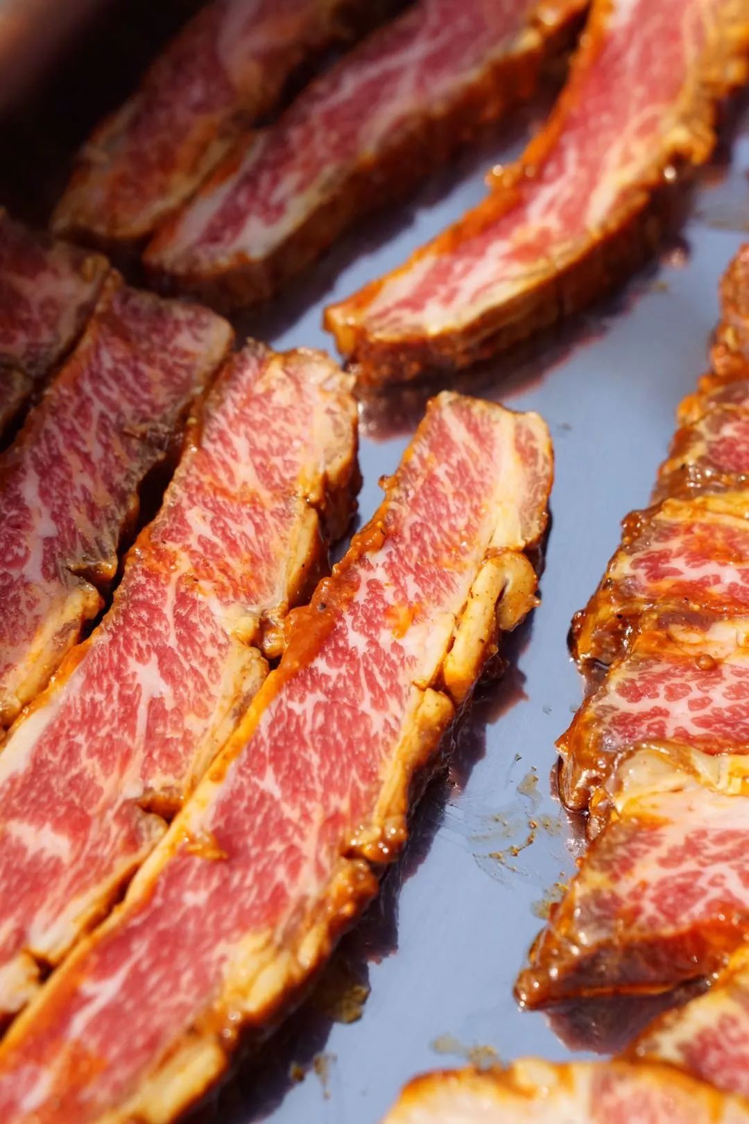 店里的牛肉都是从美国和澳洲进口的。整头牛都被塞进了冰柜—肉眼、西冷、肋骨、腱子肉、横膈膜、牛柳等,只要你身上摸的到的部位,似乎都可以从冰柜里摸出来。其余还有一般只能在大型进口超市看见的圣罗杰鹅肝和福克天然晶片海盐,拥有各类口味和颜色。