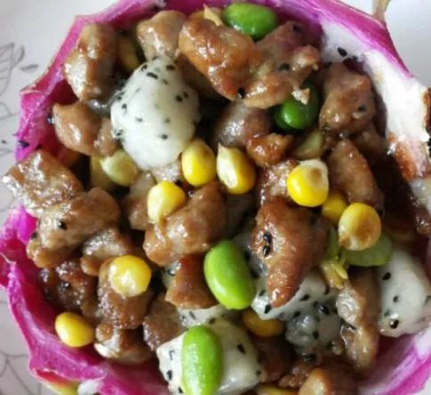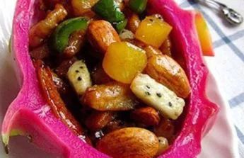 6、最后放入火龙果肉和黄桃肉、大杏仁,快速翻炒均匀即可出锅装在火龙果外壳里。