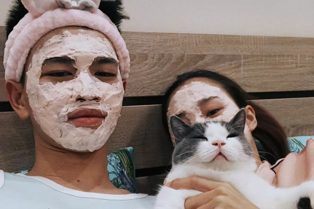 面条很爱给抬头纹护肤,抬头纹会在朋友面前说:「看我最近皮肤是不是很好!pp给我保养的!」还会把她的面膜袋里剩下的汁、一些边角料拿来抹在脸上。面条帮他修眉、去黑头、敷面膜?简直是夫妻双双把家还,之细致之认真之和谐。