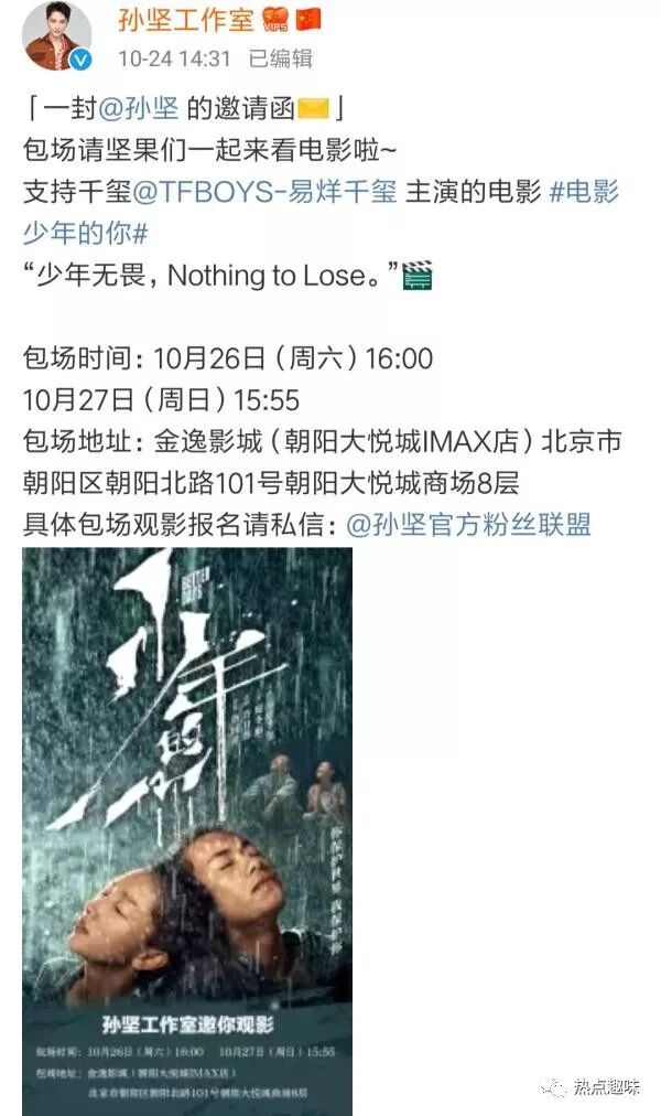 而在上映过程中,千玺个人并没有发博宣传,而是直接去到了电影院,现场观影。而在电影上映之前,千玺的多位好友便已进行了包场的活动,其中便有孙坚以及易燃装置的成员们。