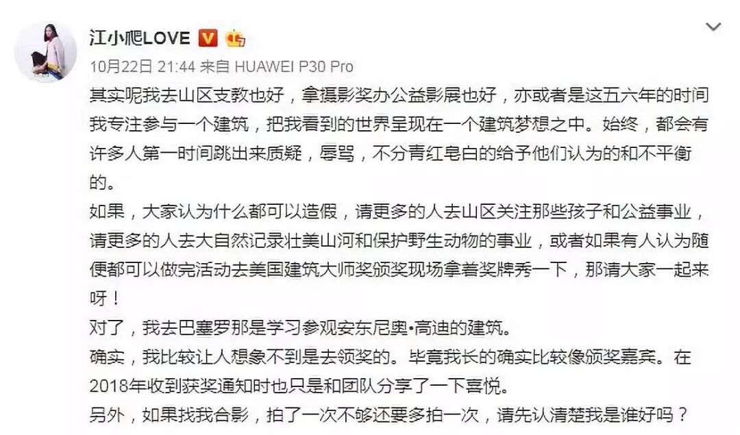大师就是大师,回应质疑的方式都跟外面那些人不太一样。 你们说我造假,可是我支教过啊。 你们说我造假,可是我还拿过摄影奖啊。 你们说我造假,你行你上啊! 看来江一燕大师不光是建筑行业的佼佼者,更是在教育、摄影领域百花齐放,甚至还是牛头不对马嘴式话术的集大成者。 随后与这个奖项合作的翻译团队在微博上爆料,奖项的创办人根本都不认识江一燕,更没听说过她获得过什么奖。