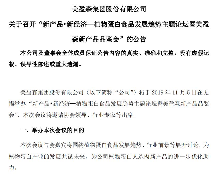 10月24日晚间,美盈森发布公告称,公司将于11月5日在无锡举办 “新产品新经济—植物蛋白食品发展趋势主题论坛暨美盈森新产品品鉴会”,本次参与品鉴的产品包括plantmeat牛肉汉堡、plantmeat鸡柳(植物蛋白鸡柳)等系列产品。