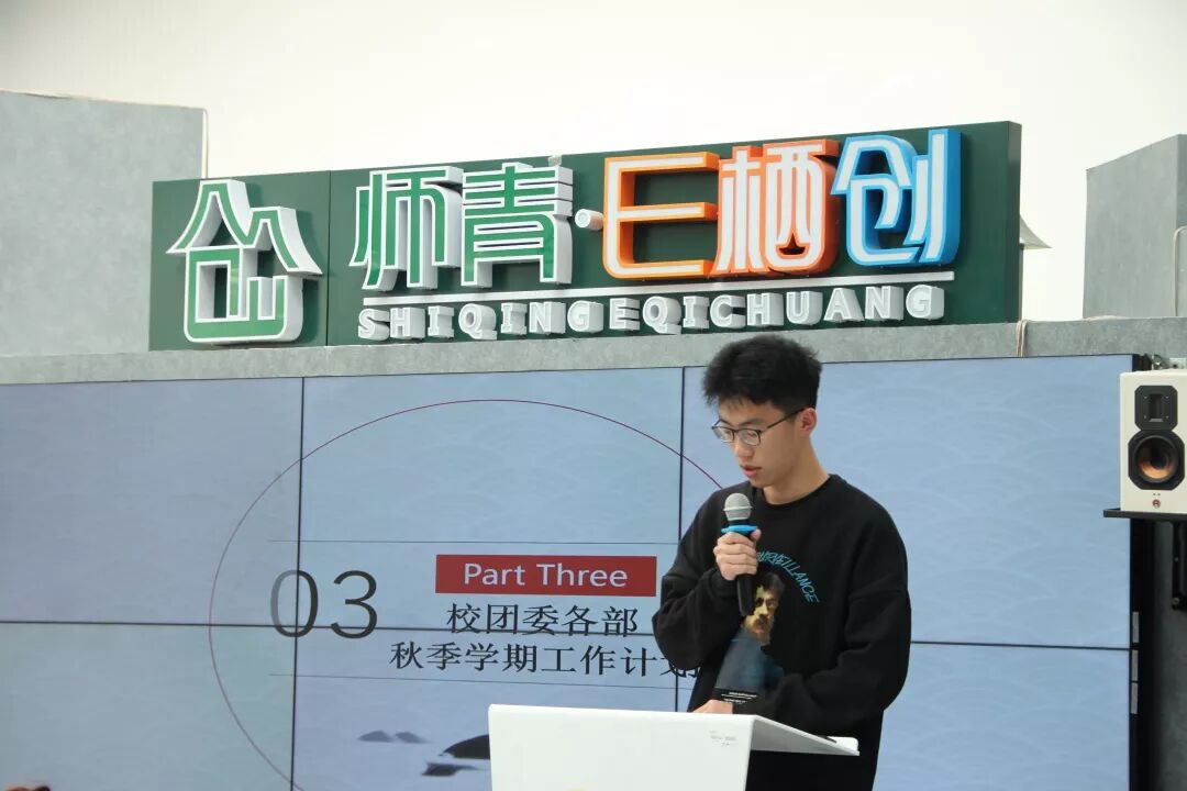 接着,校团委各部门学生工作负责人介绍负责部门秋季学期工作计划。负责人汇报了各自中心的组织架构概况,并对近期的特色活动及规划进行了介绍。