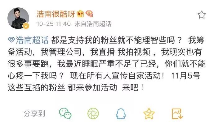 浩南发文表态都是支持我的粉丝就不能理智些吗,我筹备活动管理公司,我直播拍视频 ,我现实也有很多事要跑,我最近睡眠已经严重不足了,你们就不能心疼一下我吗,现在所有人宣传自家活动,活动当天这些互掐的粉丝都来参加活动吧!