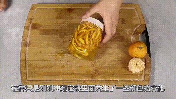 2.然后准备一个可以密封的瓶子,把橘皮放进去,在加入适量的苏打粉和温水,密封起来