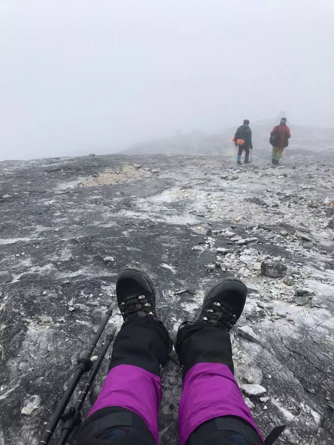 胡子哥知道我肯定不会选择下撤,让我坐在石头上,开始帮我穿冰爪,雨雪很大,他的衣服早就湿了,这时候再摘下手套无疑是冷上加冷。