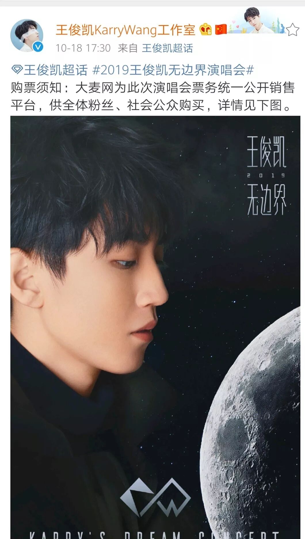 2王俊凯KarryWang工作室发布微博公布演唱会购票事宜。