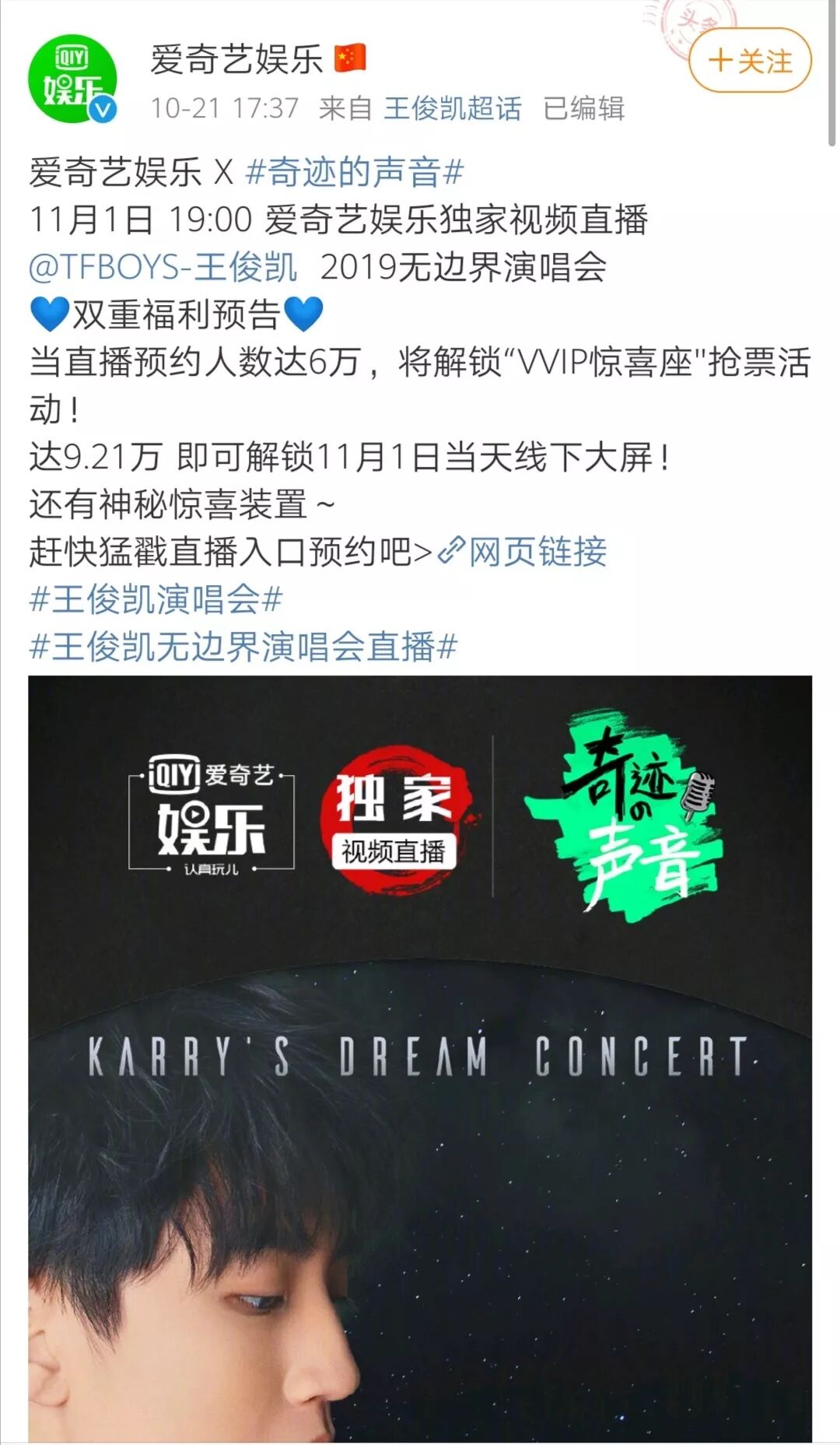 3爱奇艺成为王俊凯无边界演唱会独家视频直播平台。