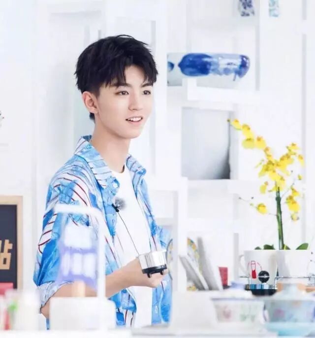近日,王俊凯穿着蓝色海岛风情衬衫录制《中餐厅》。