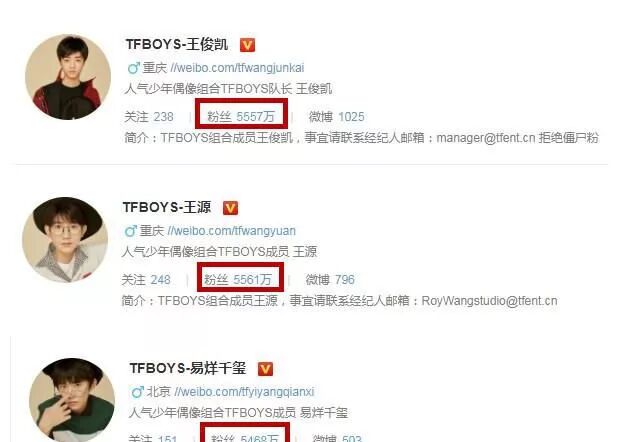而要说起时下最火的组合无疑是TFBOYS了,王俊凯王源易烊千玺他们三个人从成立这个组合开始,到现在为止已经度过了五个春秋,五年之间一起经历过的事情不是一句话就可以道得清说得明的。他们有各自的微博,粉丝数量也一直是从王俊凯到王源再到易烊千玺依次递减的。
