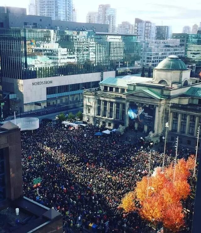 今天(10月25日),温哥华市中心被超过15000名情绪激动的市民占领,人们顶着90km/h的狂风,举着标语喊着口号穿过温哥华的交通要道。