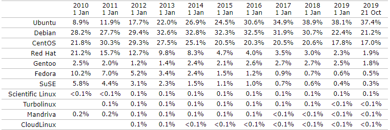 而在 2010 年 1 月时,Ubuntu 仅占 8.9% 的市场份额,排在 Debian、CentOS、Red Hat 和 Fedora 之后,在当时是位居第五的 Linux 发行版。