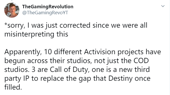 曾准确爆料《使命召唤》消息的Twitter用户TheGamingRevolution援引一个匿名人士消息称,动视目前有十款不同的游戏在开发,这是涉及到所有的工作室,不单单是COD工作室。这其中包括3款《使命召唤》游戏以及一个新的第三方IP以填补《命运》的空缺。