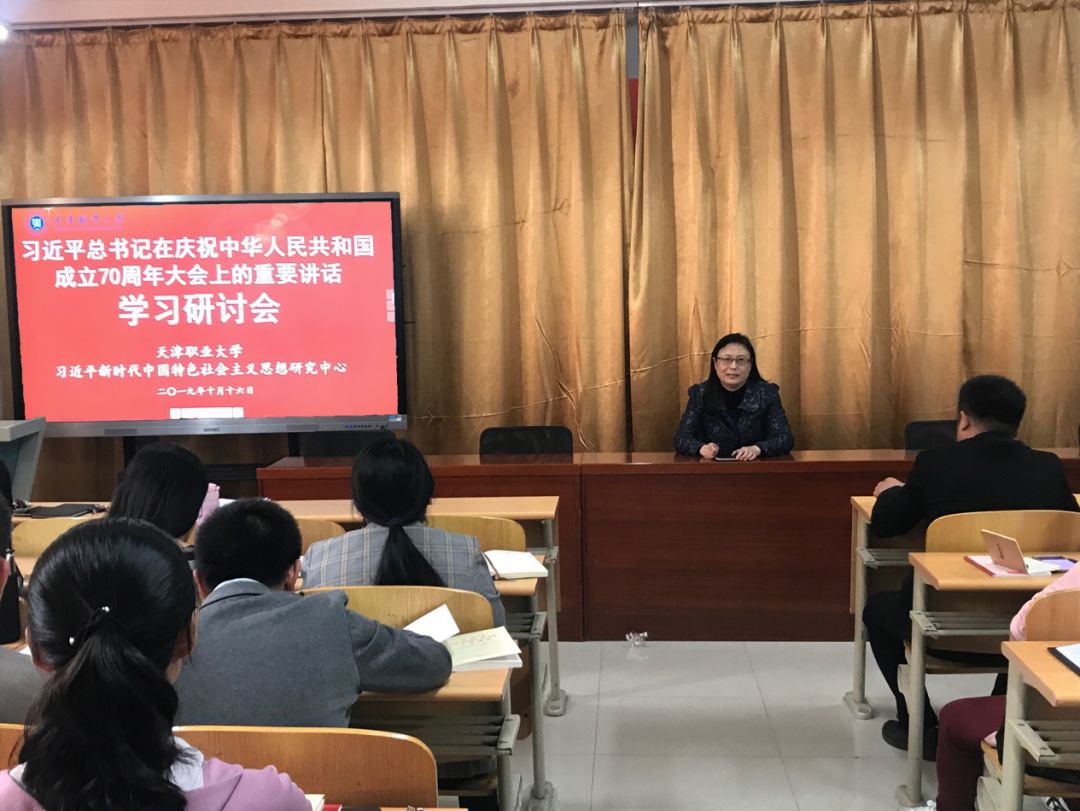 研究中心执行主任王丽华教授主持本次学习研讨会并作首先发言,她指出,习近平总书记的讲话高度评价了新中国成立的历史意义,深刻阐明了新中国70年间创造的人间奇迹,豪迈展望了中华民族伟大复兴的光明未来。王教授强调,作为思政课教师,我们要深刻领会习近平总书记的讲话精神,并将本次学习研讨的成果及时融入思政课教学中,帮助学生树立正确的历史观,提升学生的爱国情与报国志。