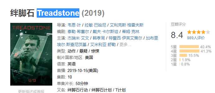 不过,友情提示:这部借以《谍》故事中“绊脚石”组织名号的剧,实际剧情可能要与原故事有所区别。二者唯一相同的就是“好看”,目前这部剧在豆瓣评分为8.4分,烂番茄95%爆米花鲜度,iMDb为7.3分。