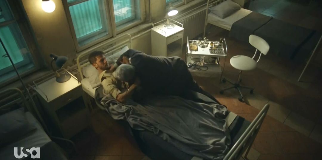 很显然,男子大概率作为主角情况下如果就这么死了,不仅有点蠢,似乎剧也得结束。女子走到走廊中后也突然明白了这点,她转身来到停尸间,看到刚才和死尸互换穿着的男子。(这里稍微吐槽下,主角被追赶上时间其实很短,但他竟然能和死尸换了全套衣服,并且还要搬尸体、扔尸体,这一套动作时间很难让人觉得有那么短)