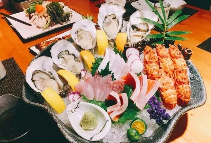 刺身拼盘有法国天宝生蚝加上一些柠檬汁生蚝入口水嫩鲜甜~回味还一直有新鲜生蚝的香味!
