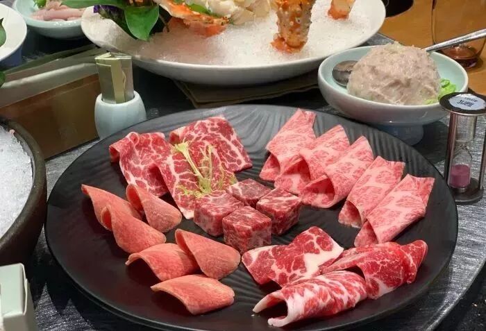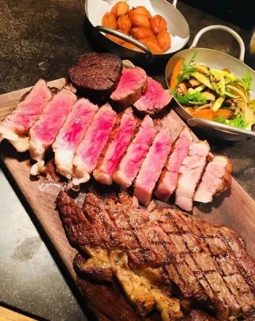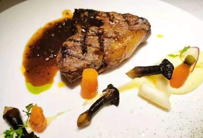 牛排自带奶香味与黄油的香气融合在一起外焦里嫩鹅肝和三文鱼新的做法也很不错还有带子,又大又嫩,上面配有鱼子酱