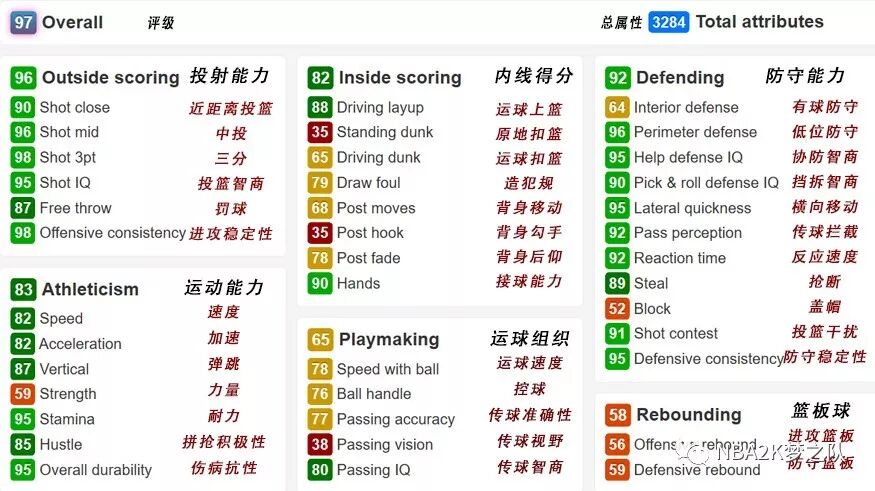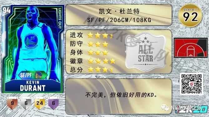 其实对于杜兰特这种超模球员来说,2K对这类球员经常会限制一些属性或徽章,比如粉大帅只有三紫,但这依然不会妨碍他们的好用程度,毕竟2K是个建模游戏,杜兰特也是如此,2米06身高加上超长臂展,在SF位置上除了字母哥,很难有人在模型和身高上与其比肩,反正我是没见过有哪张杜兰特不好用的。