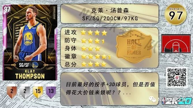 粉钻佩贾其实就是纯投手,真没啥好说的,所以就跳过吧。让我们直接来看本次的锁卡奖励:粉钻克莱·汤普森。这张克莱的投射能力已达毕业级水准,其中中投96,三分更是高达98,同时外线热区全满,投篮包虽不及去年那么优秀,但也还OK,更有多达11枚投篮紫章的加持,可以说这张卡的投篮已经到了无可提升的地步。