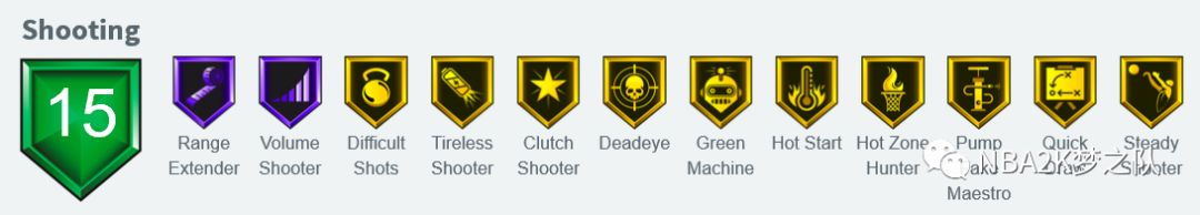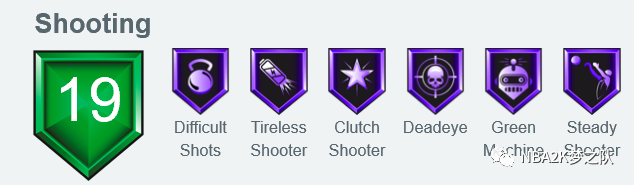 徽章方面,6枚紫章的数量终于追上了老詹,而且这些徽章均为投篮型:高难度投篮手、永动机射手、绿色机器、稳定射手、关键射手和神射手。