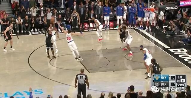 末节还剩4分多钟时,篮网和尼克斯战成了104平,欧文用一记突破后的指尖挑篮命中得分,帮助篮网锁定优势。不过,艾灵顿三分飙中,巴雷特快攻上篮,此后欧文连续失误,普林斯、丁威迪相继不中,双方开始了长达3分钟的互相打铁。