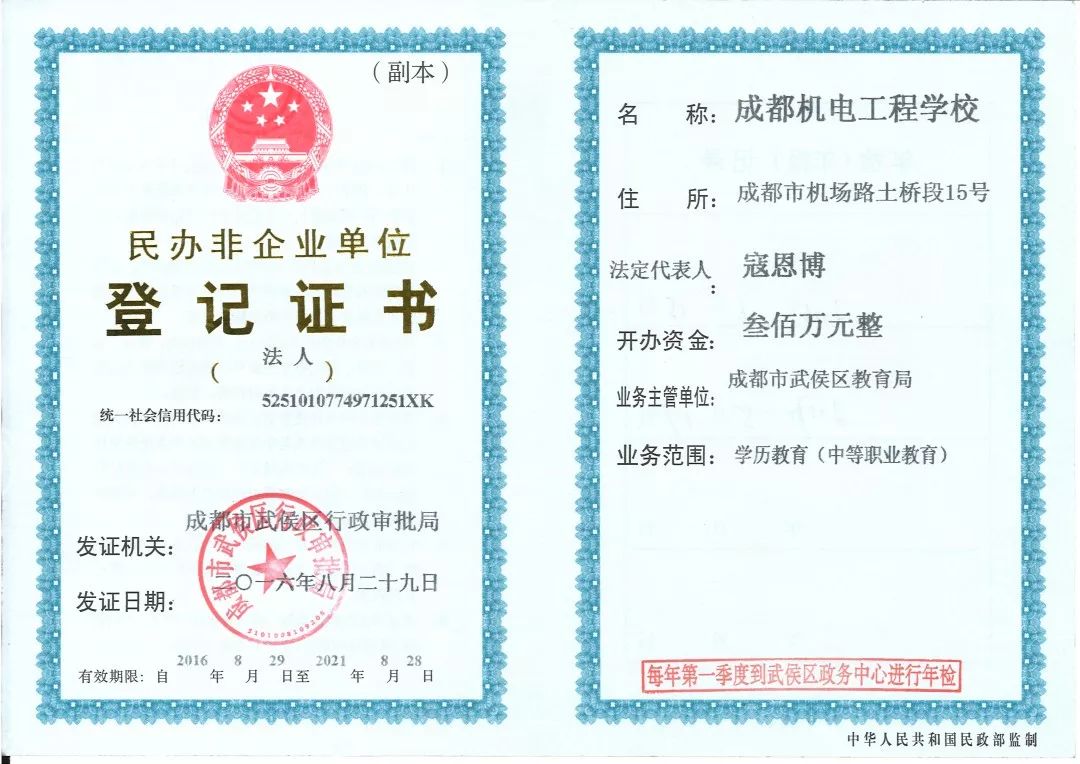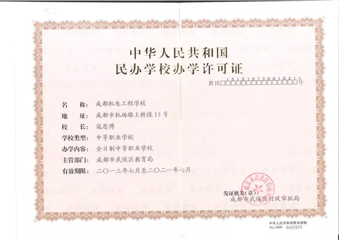成都机电工程学校是经教育主管部门批准的全日制中等职业学校(招生代码:51198),地处成都市郫都区。隶属于四川恩大集团有限公司。四川恩大集团产业覆盖航空、航海、轨道交通、健康、教育等领域。
