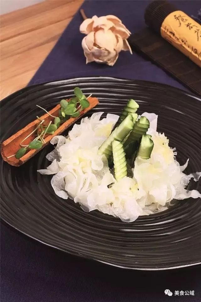 有机黄瓜150克用锯齿刀切成长短不一的条,竖立在盘中;鲜银耳200克摘去杂质洗净,沥干后围着黄瓜摆一圈,旁边点缀一截桂皮、少许香椿苗,带两小碟酱油、现磨山葵根即可走菜。