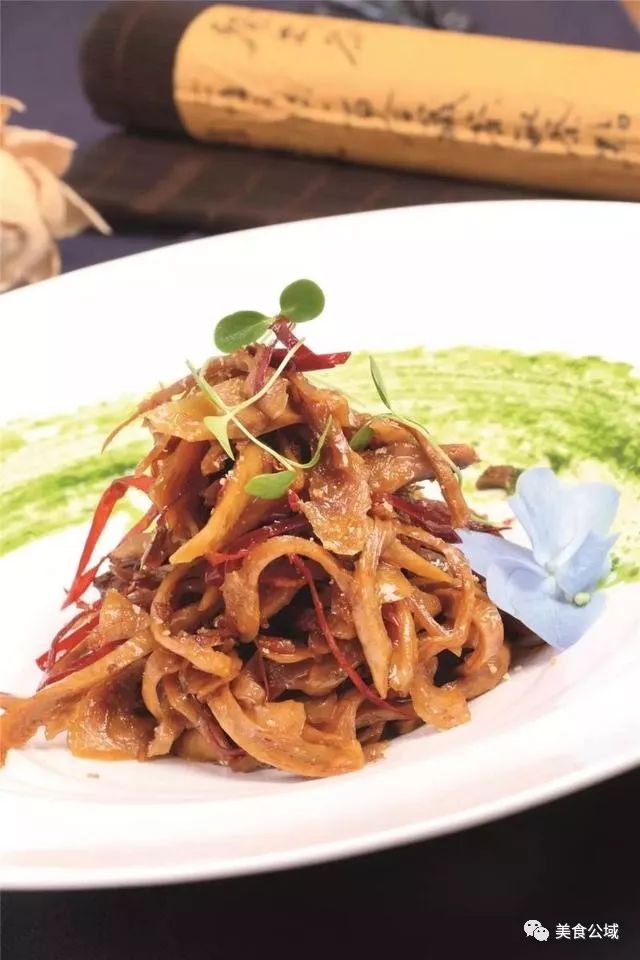 川菜中有一种技法叫“炸收”,多用于牛肉、鸭子等荤类原料,将食材先入油清炸,再另起锅加清汤、调料小火煮至收汁入味。这道豆筋采用“炸收”的手法制作,在传统陈皮味型菜肴的基础上做了少许改良:用九制陈皮、甘草熬水,煮出的豆筋味道甘香;出锅前再撒上一层陈皮粉,香味更浓郁。
