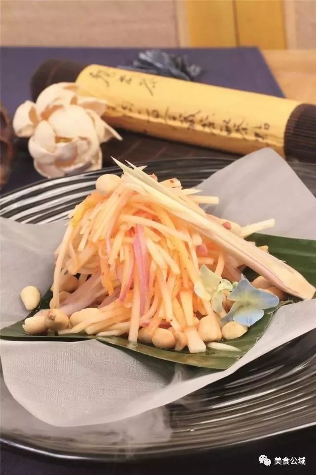这道菜改良自泰国经典“拌木瓜”,最大的不同之处在于料汁的调制,去掉鱼露,加入了菌菇水、鲜藠头、小米辣,具有中餐气息,也更符合本地食客的口味。