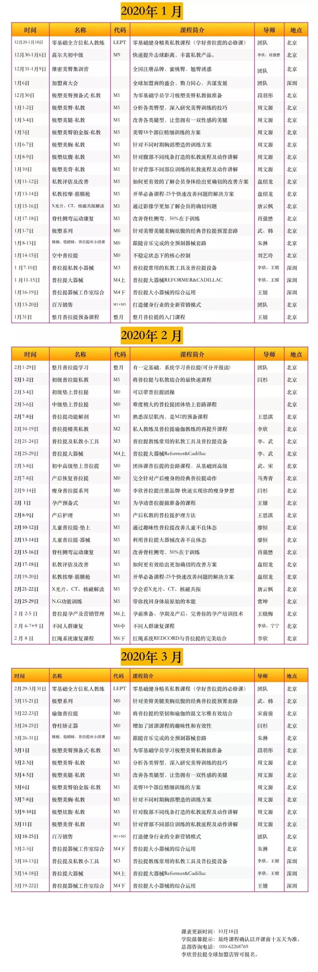 涉及普拉提器械、垫上普拉提、康复普拉提、团体课程、儿童体适能、私教营销、经营管理论坛、瑜伽、功能训练、康复课程、运程解析等专业课程;