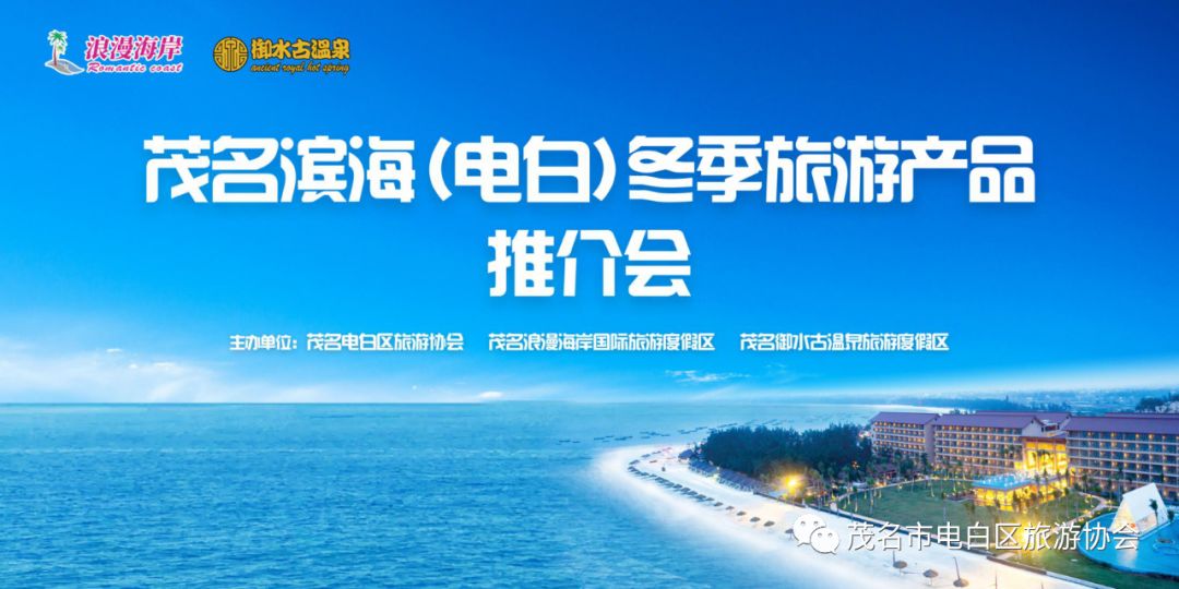 10月23至24日,茂名滨海(电白)冬季旅游产品推介会在御水古温泉和茂名浪漫海岸举行。推介会由茂名市电白区旅游协会、茂名浪漫海岸国际旅游度假区和茂名御水古温泉度假区主办。茂名市旅游协会会长陈中波出席推介会;茂名市旅游协会常务副会长、电白区旅游协会会长、广东万旅集团董事总裁何志军致辞;全国著名城市旅游营销专家、中国旅游营销专家委员会首批专家、广东万旅集团独立董事、发展战略顾问、茂名市电白区旅游协会专家顾问郑泽国出席推介会并发言;茂名市电白区旅游协会常务副会长李顺出席推介会;电白区旅游协会副秘书长、御水古温泉旅游度假区常务副总经理简杏昌对电白全域旅游作推介。来自茂名、湛江、阳江、肇庆、珠三角等广东省内,广西、湖南、贵州、重庆、成都等西南五省和港澳的旅游界受邀嘉宾参加了推介会,并在会上作发言。