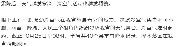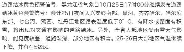 降水所到之处,由于早晚温度较低,部分地区将出现道路结冰,黑龙江省气象台10月25日11时继续发布道路结冰黄色预警信号。