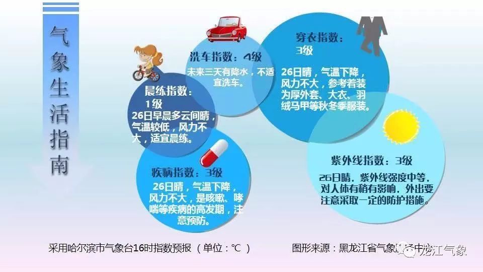 25日夜间最低气温:大兴安岭北部-13~-15℃,大兴安岭南部-9~-11℃,黑河-6~-8℃,伊春、齐齐哈尔北部、绥化北部-3~-5℃,其它地区-2~0℃。