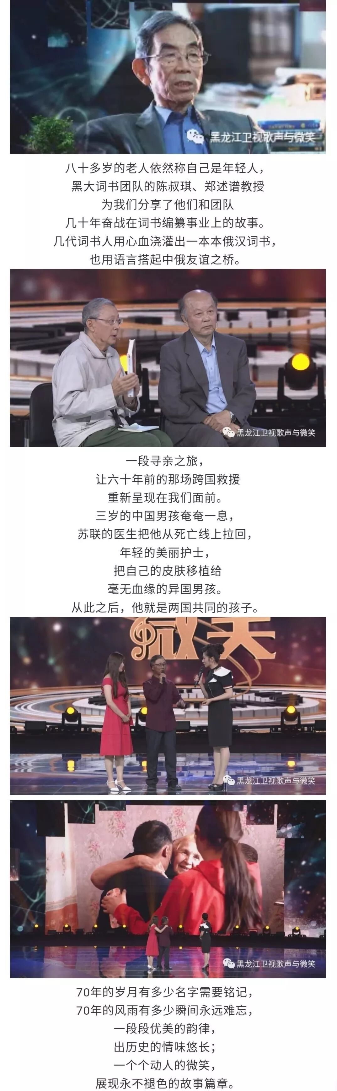 70年间中俄两国用歌声与微笑搭建起世代友好携手共进的友谊之桥。70年后的今天,那些中俄友谊的见证者,带着自己饱含深情,带着欢笑和泪水交织的故事来到《歌声与微笑》的现场。回首过去,展望未来。